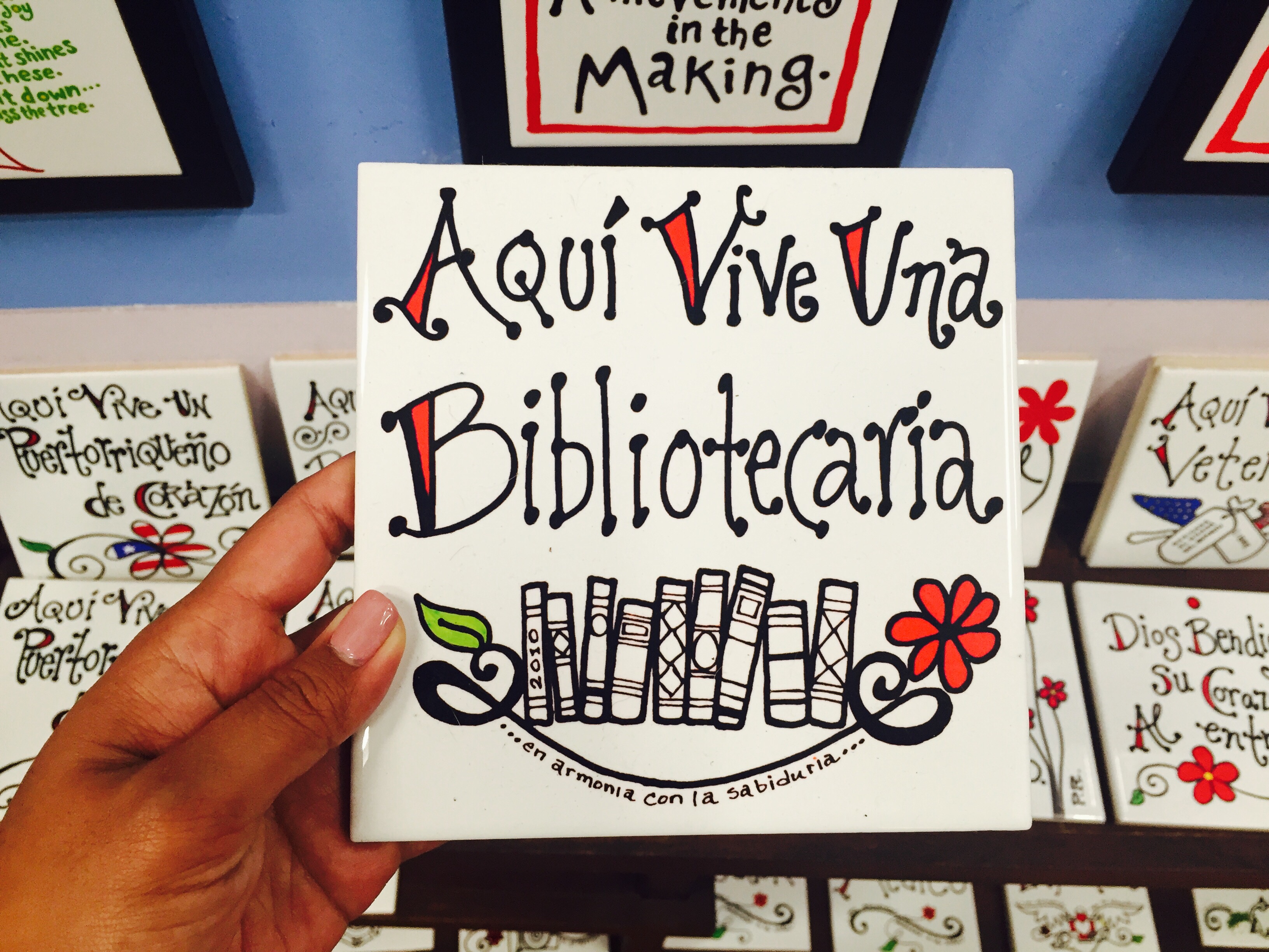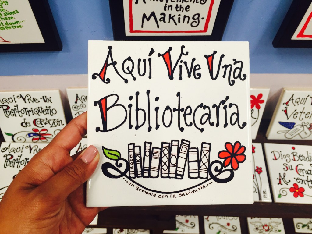 I came across The Poet’s Passage in Old San Juan owned by the poet Lady Lee Andrews and her husband, who’s also an artist. There were books and poems on the wall, different works of art, a section for an open mic and “statement tiles” as I’d like to call them. Here’s one I found that’s perfect for this blog: